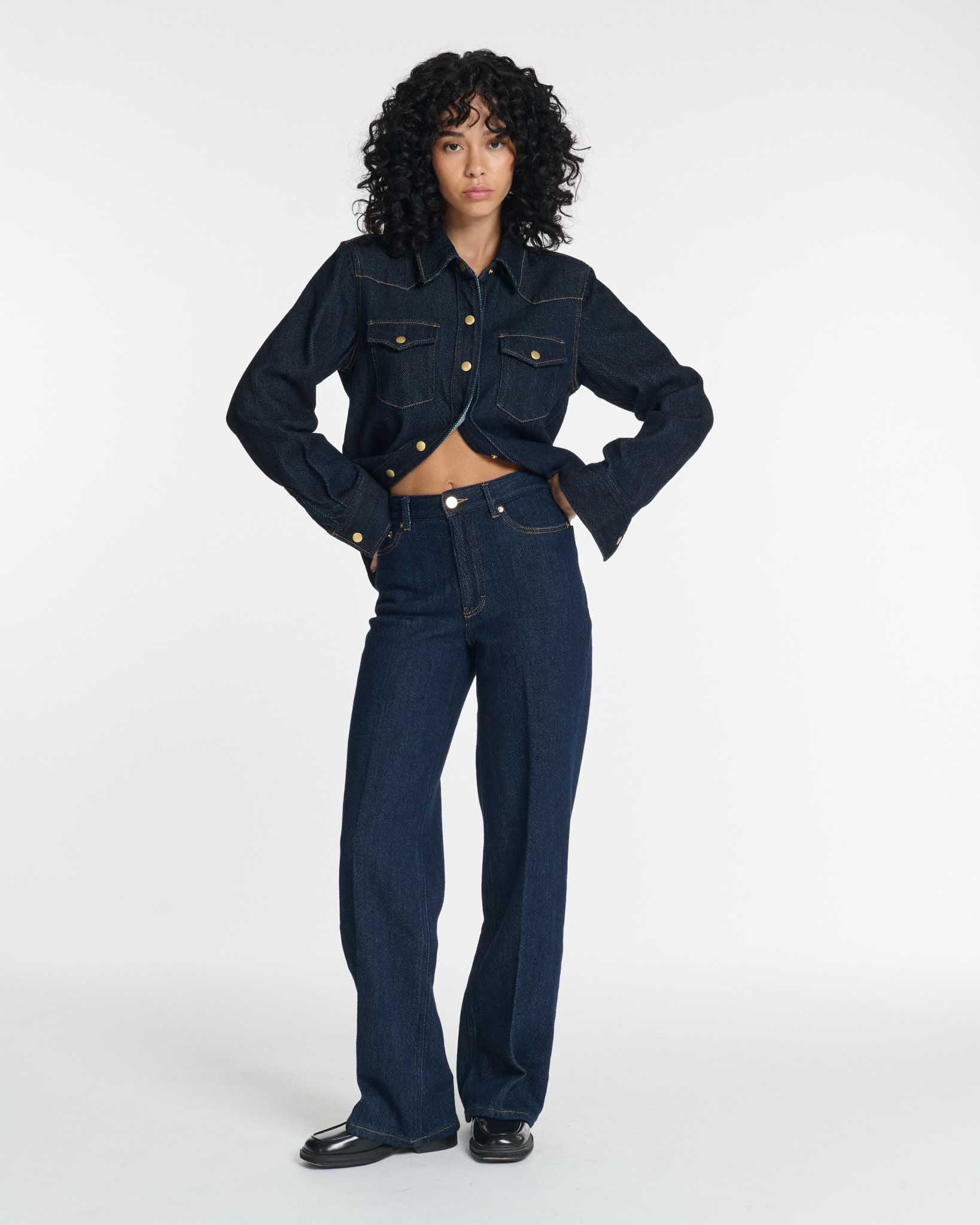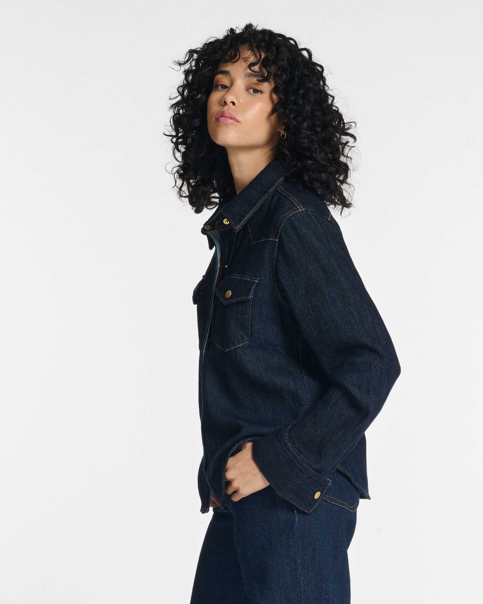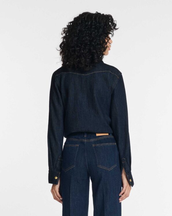 Camisa con corte entallado, cuello clásico y bajo redondeado definen la silueta.
