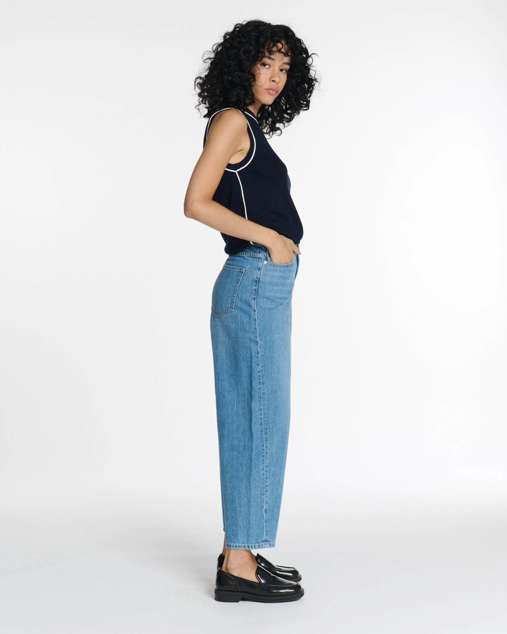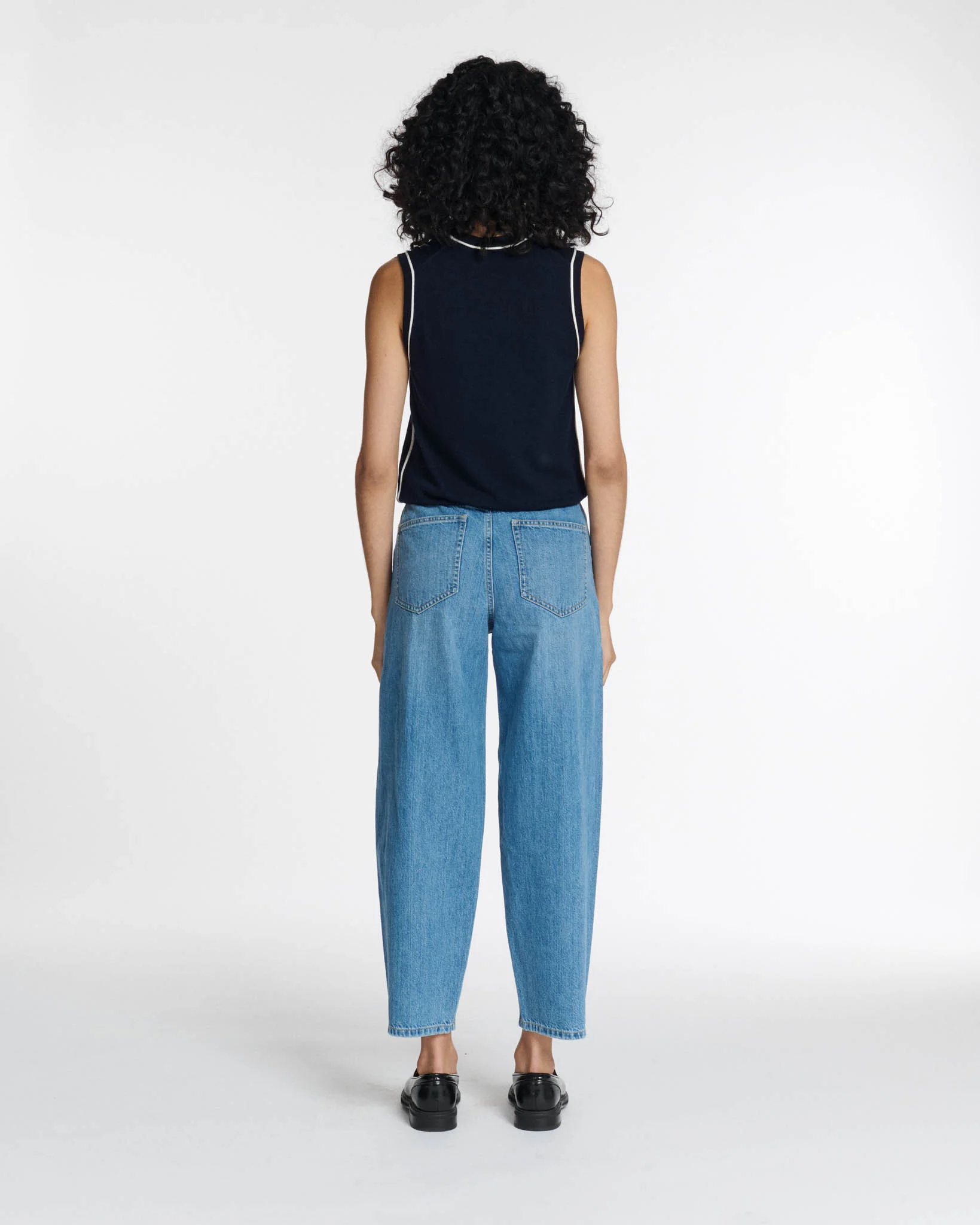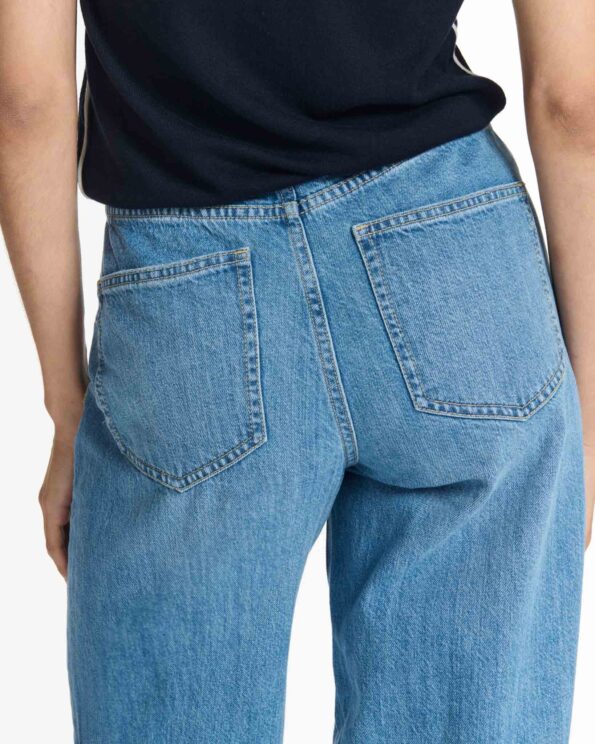 Vaquero de cintura alta y corte curvo.