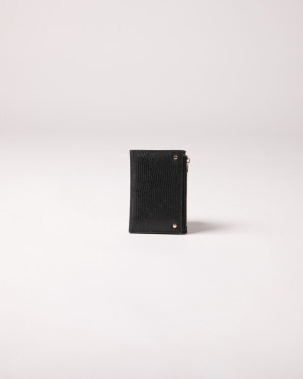 Cartera completa y compacta, con varias ranuras para tarjetas, tanto en el interior como en el exterior, tres compartimentos para billetes y documentos, y un compartimento con cremallera para monedas y llaves.