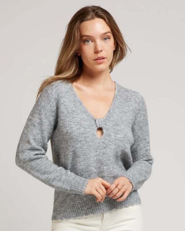 Suéter de punto suave con un elegante cuello en V, realzado por una corbata a tono.