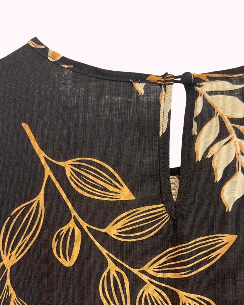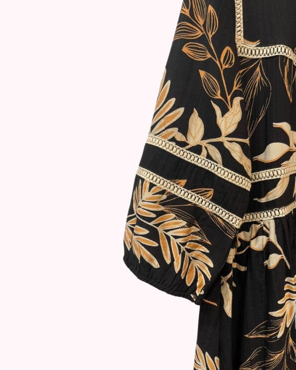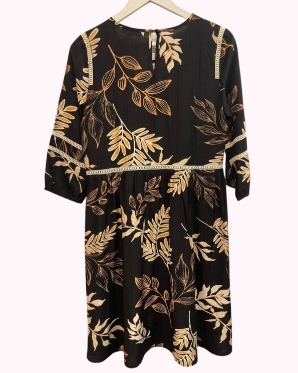Vestido negro con estampado floral, escote en pico y manga corta.