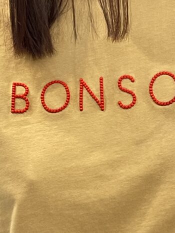 Camiseta de manga corta con mensaje «BONSOIR» en dos colores.