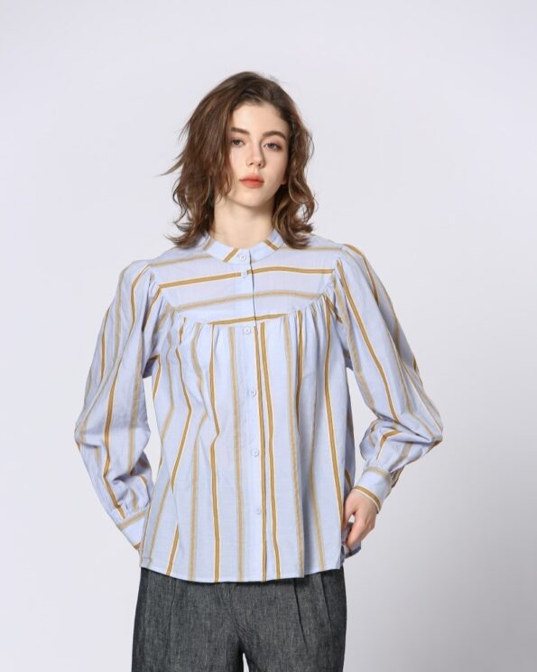 Blusa de rayas verticales con cuello redondo y frunce en a zona del pecho.