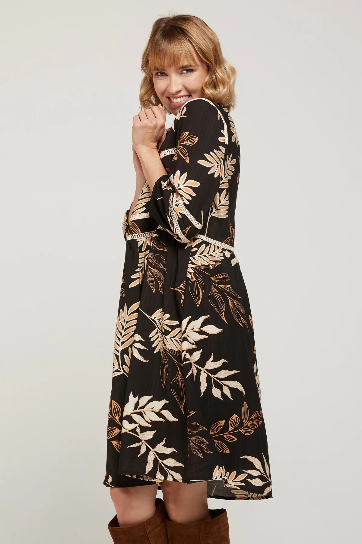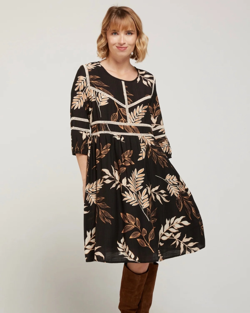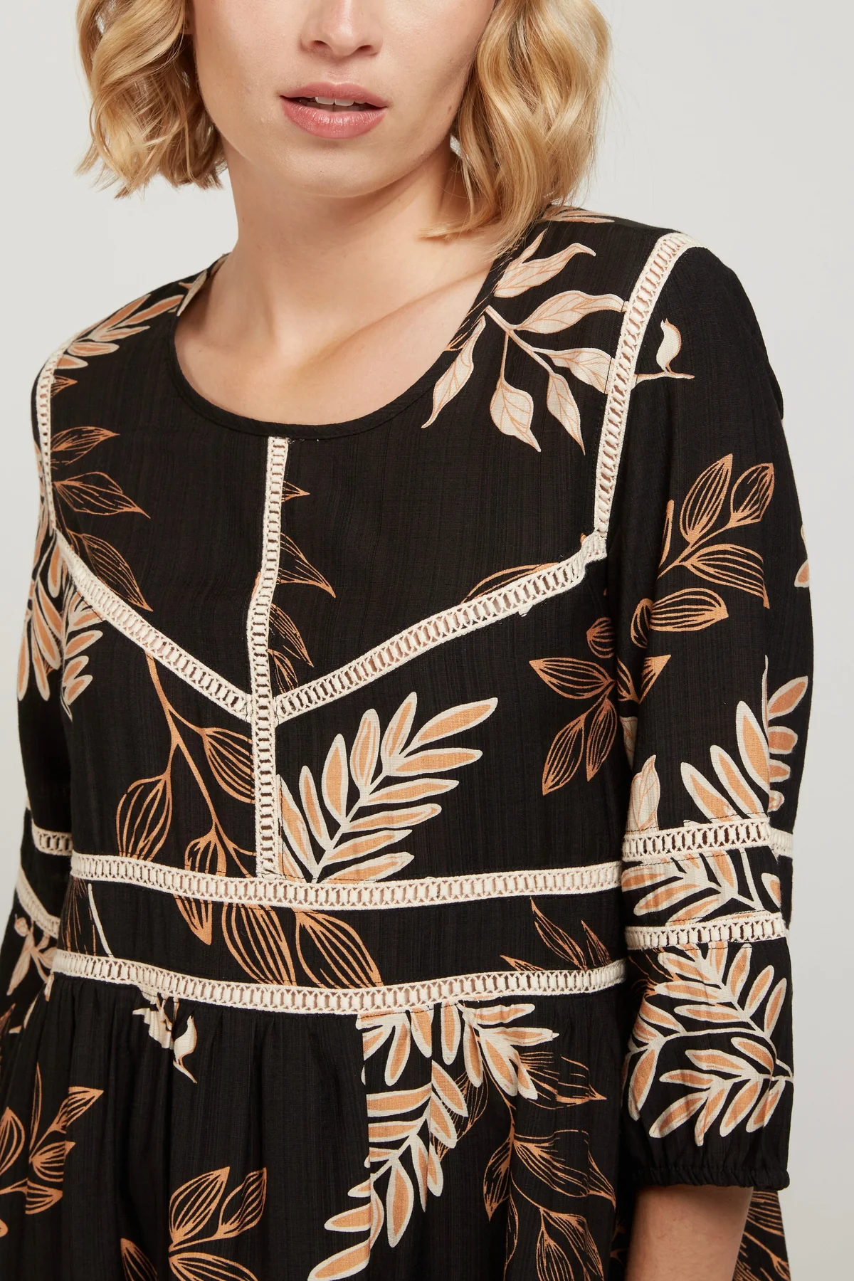 Vestido negro con estampado floral, escote en pico y manga corta.