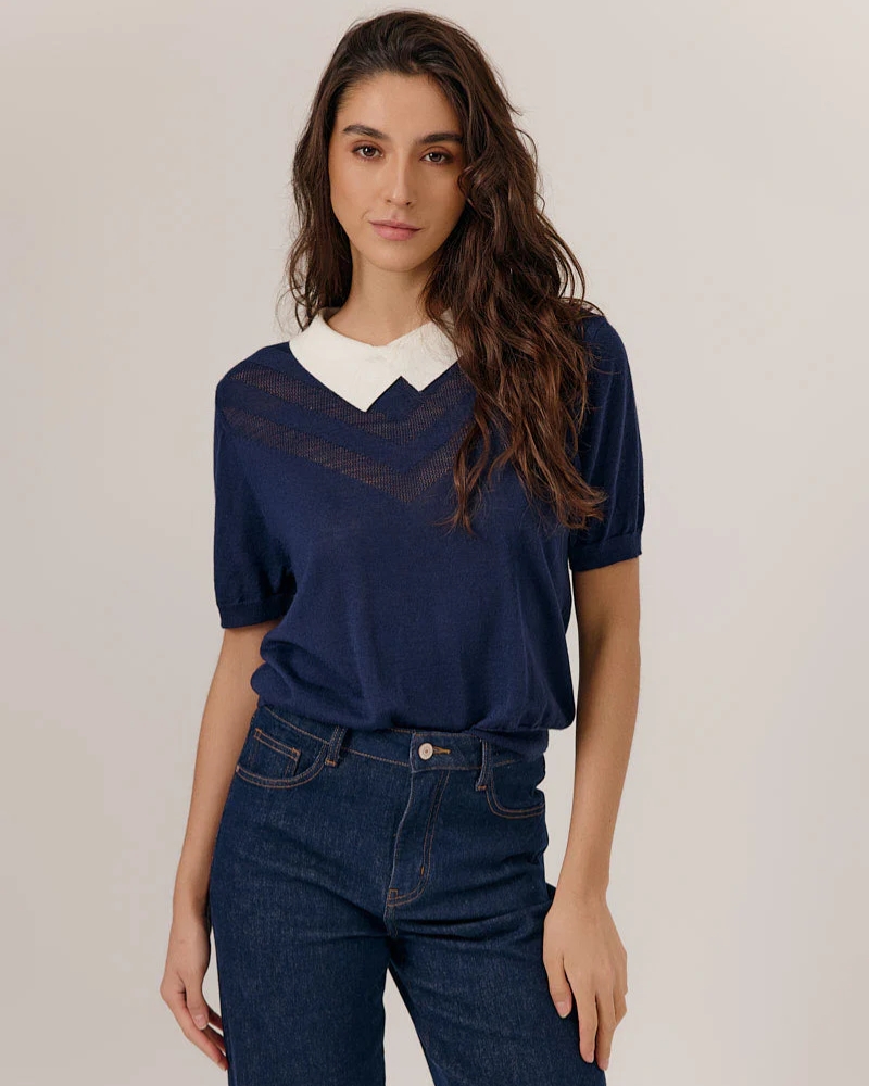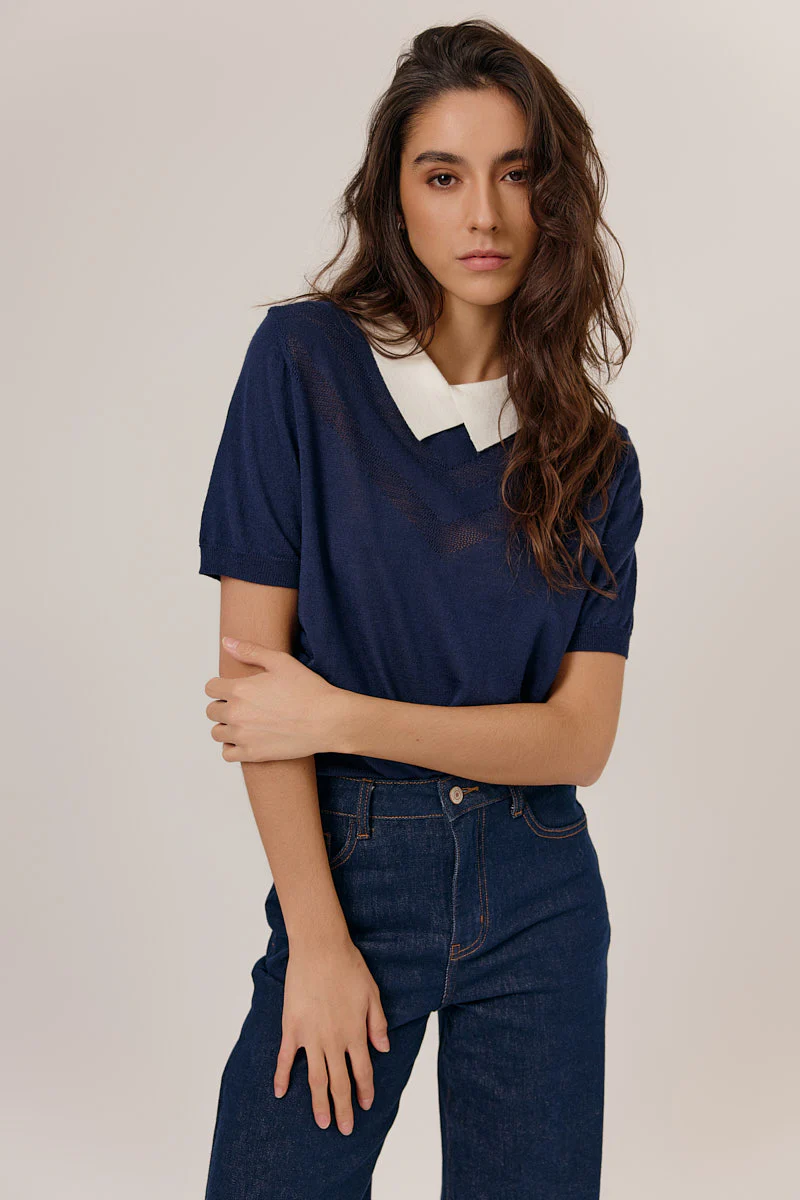 Jersey de manga corta con cuello camisero en blanco.
