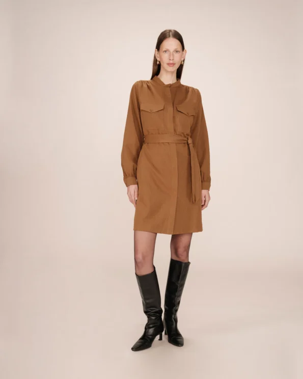 Vestido corto con corte recto, mangas largas con puños abotonados y cuello mao.