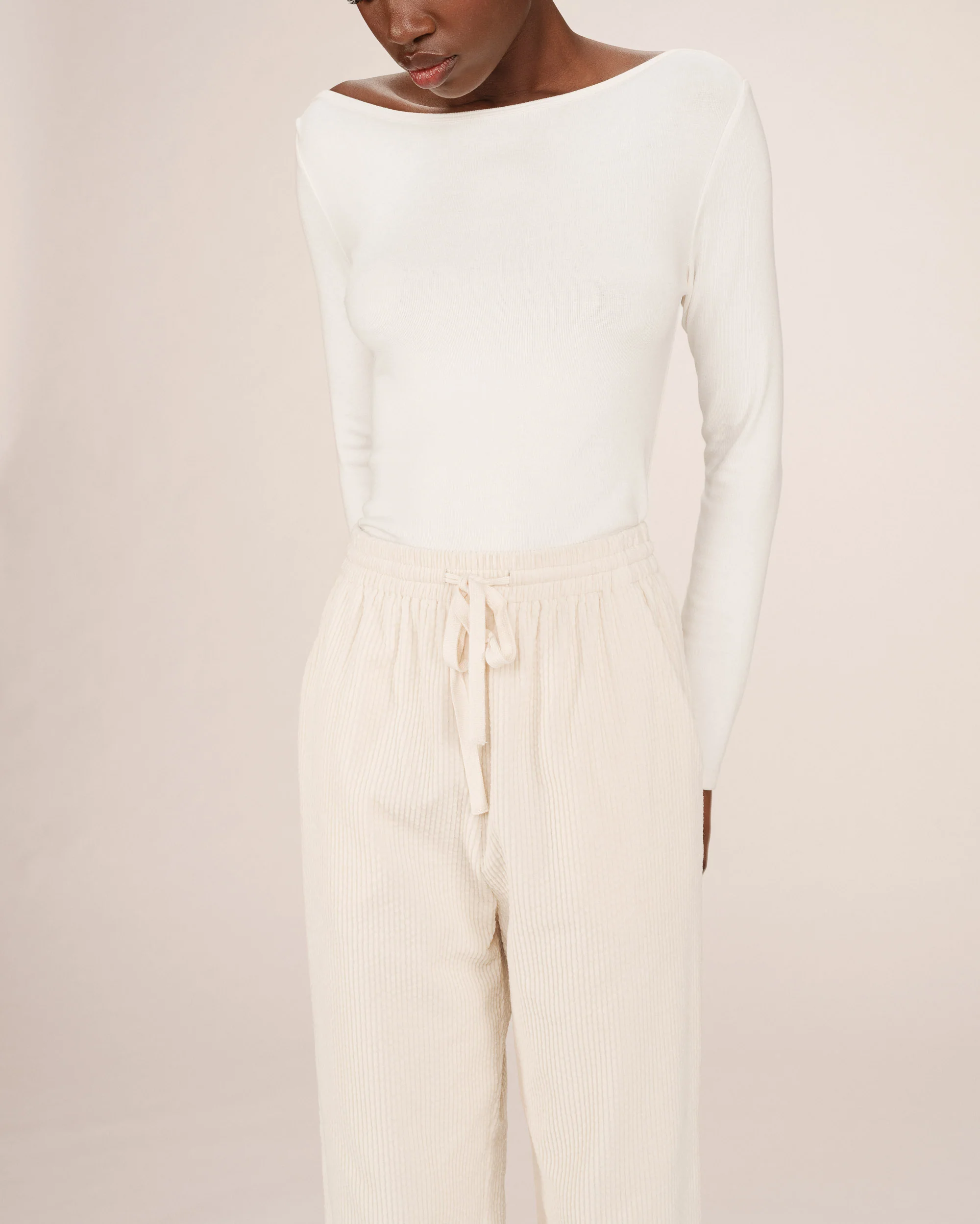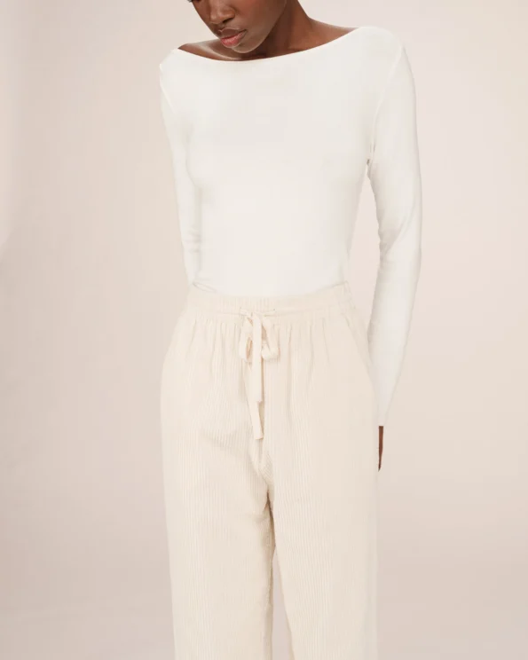 Pantalones de pana con corte recto, pernera ancha, cinturilla elástica con cordón y bolsillos italianos delanteros.