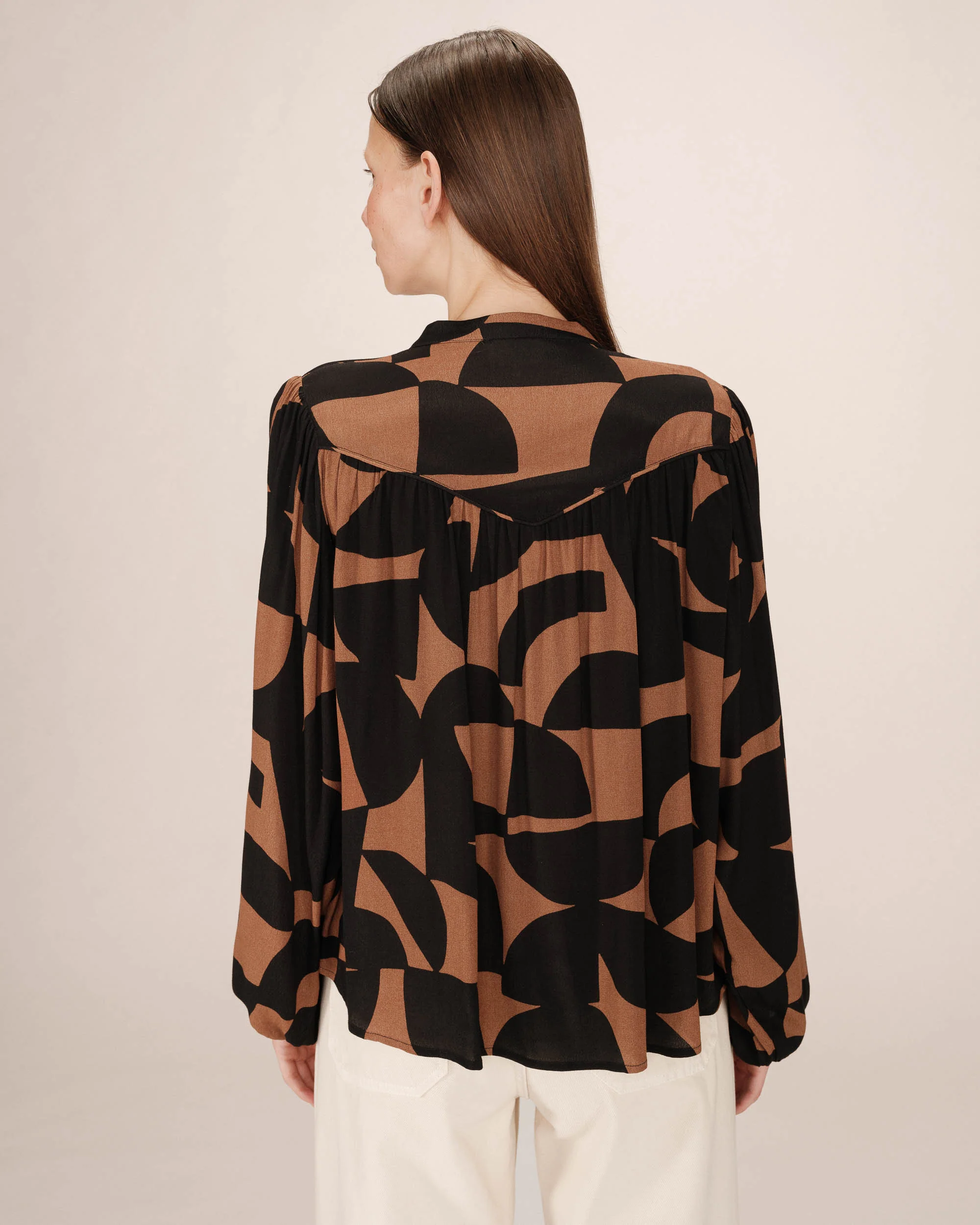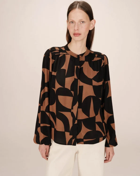 Blusa con estampado geométrico bicolor, corte recto, manga larga con puños elásticos y cuello redondo con abertura frontal.