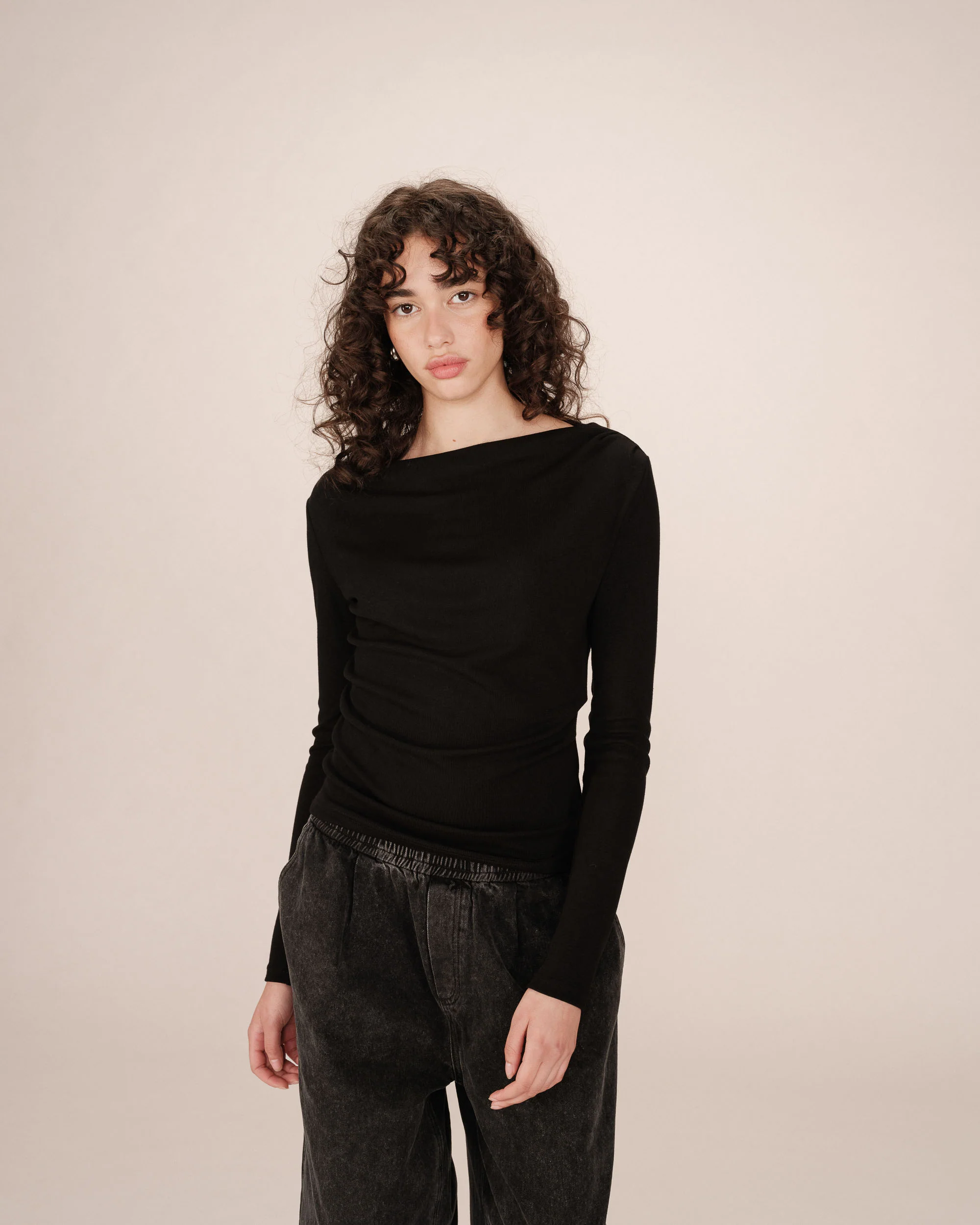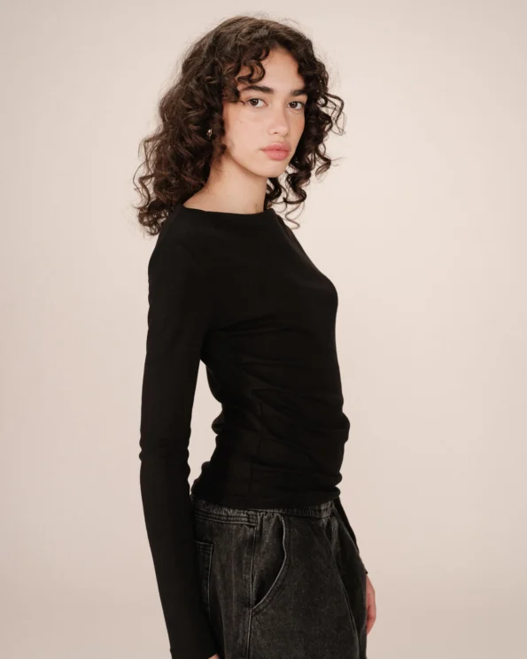 Camiseta de corte entallado, manga larga, escote barco y drapeado asimétrico en cintura y hombros.