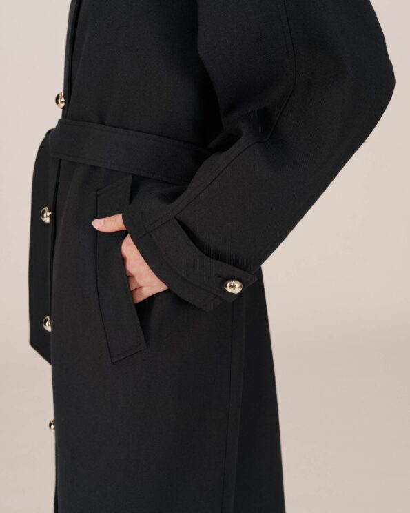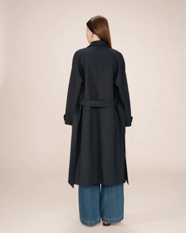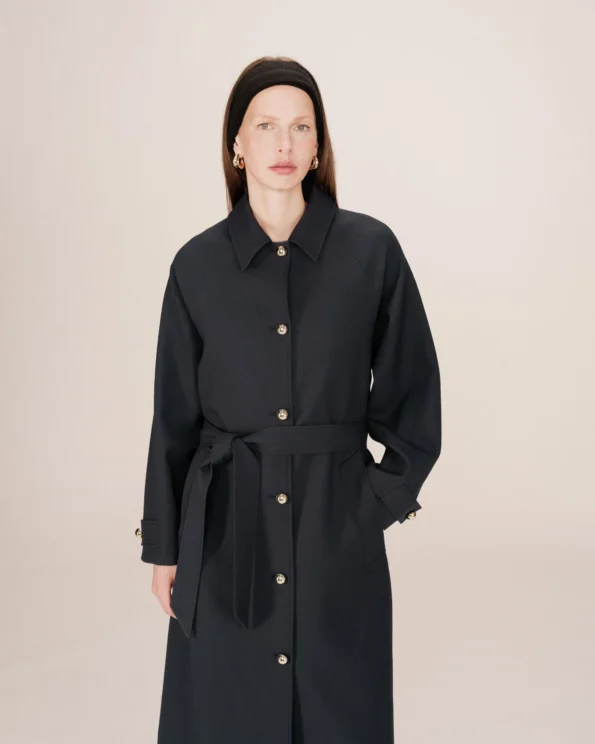 Gabardina larga con corte recto, manga larga, cuello italiano, bolsillos delanteros y cinturón extraíble.