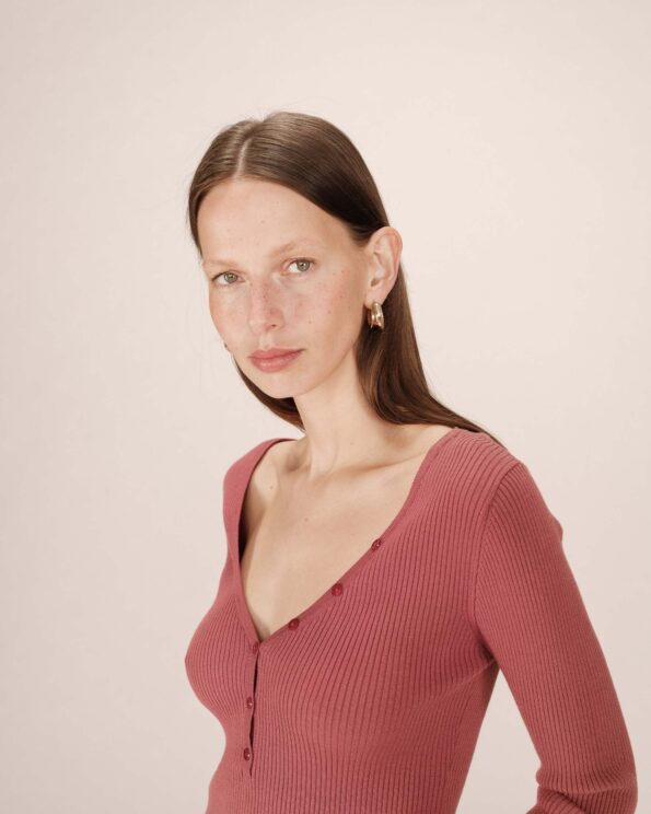 Jersey de punto fino acanalado con corte entallado, manga larga y cuello en pico con botones en el escote izquierdo.