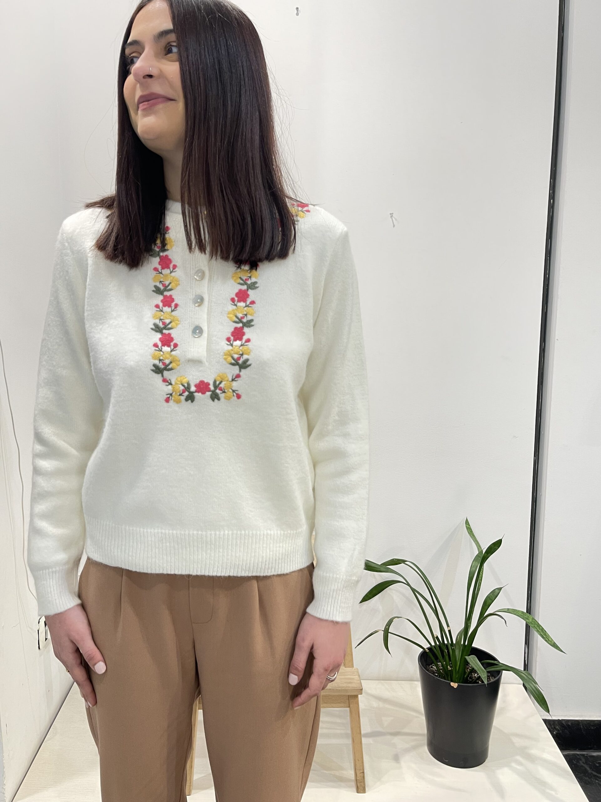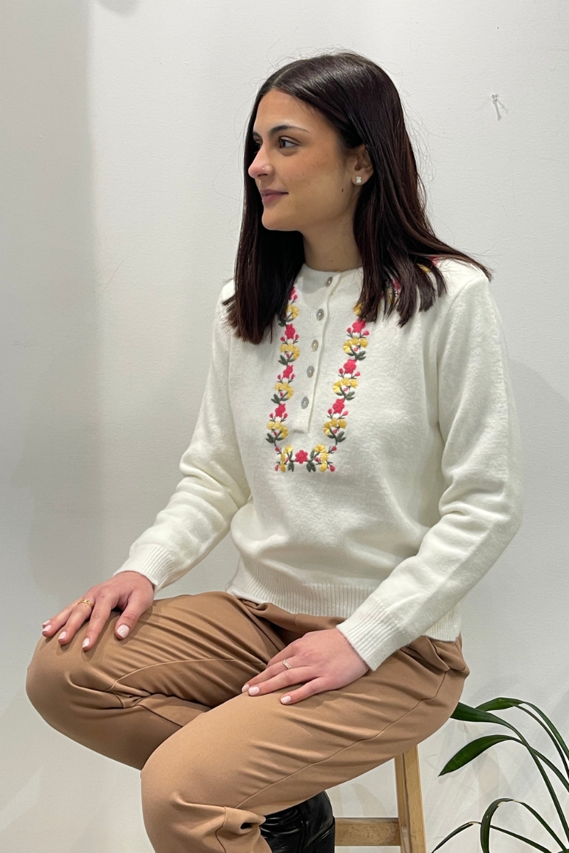 Jersey cuello panadero, manga larga y bordado floral.