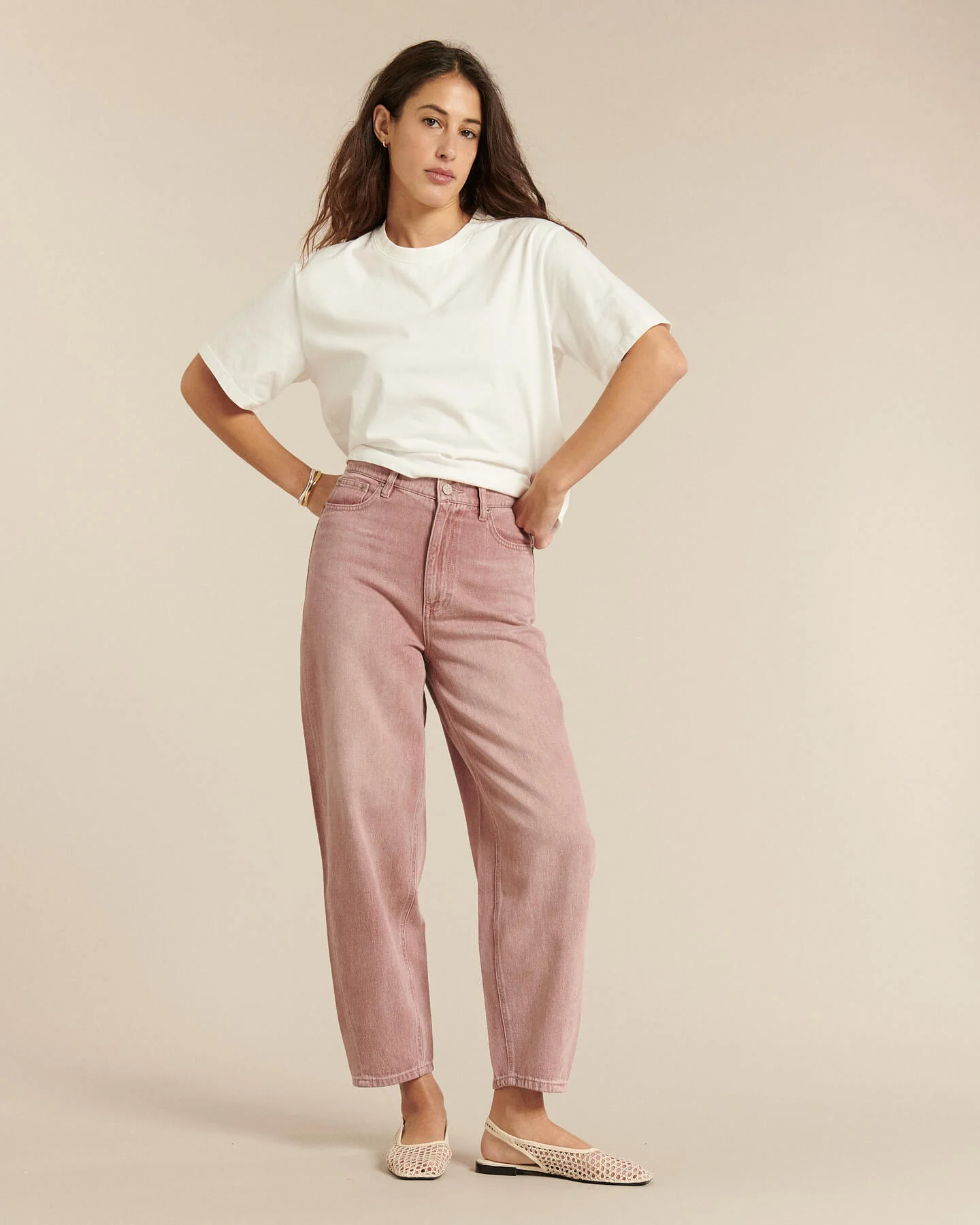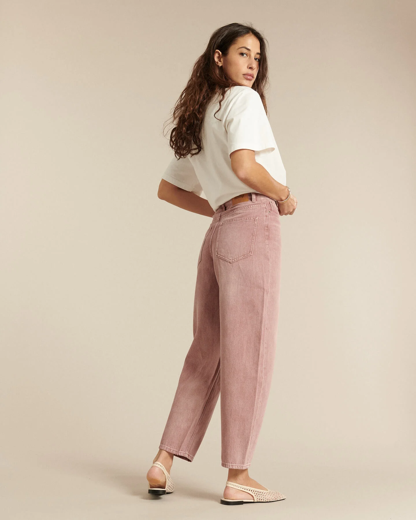 Corte BALLOON característico: cintura alta y definida, volumen redondeado en las caderas y los muslos, y estrechamiento en el tobillo.