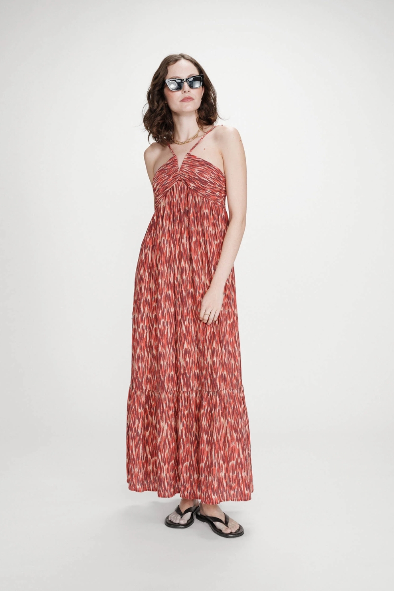 Vestido con corpiño y tirantes cruzados en la espalda, corte amplio y tela fluida.