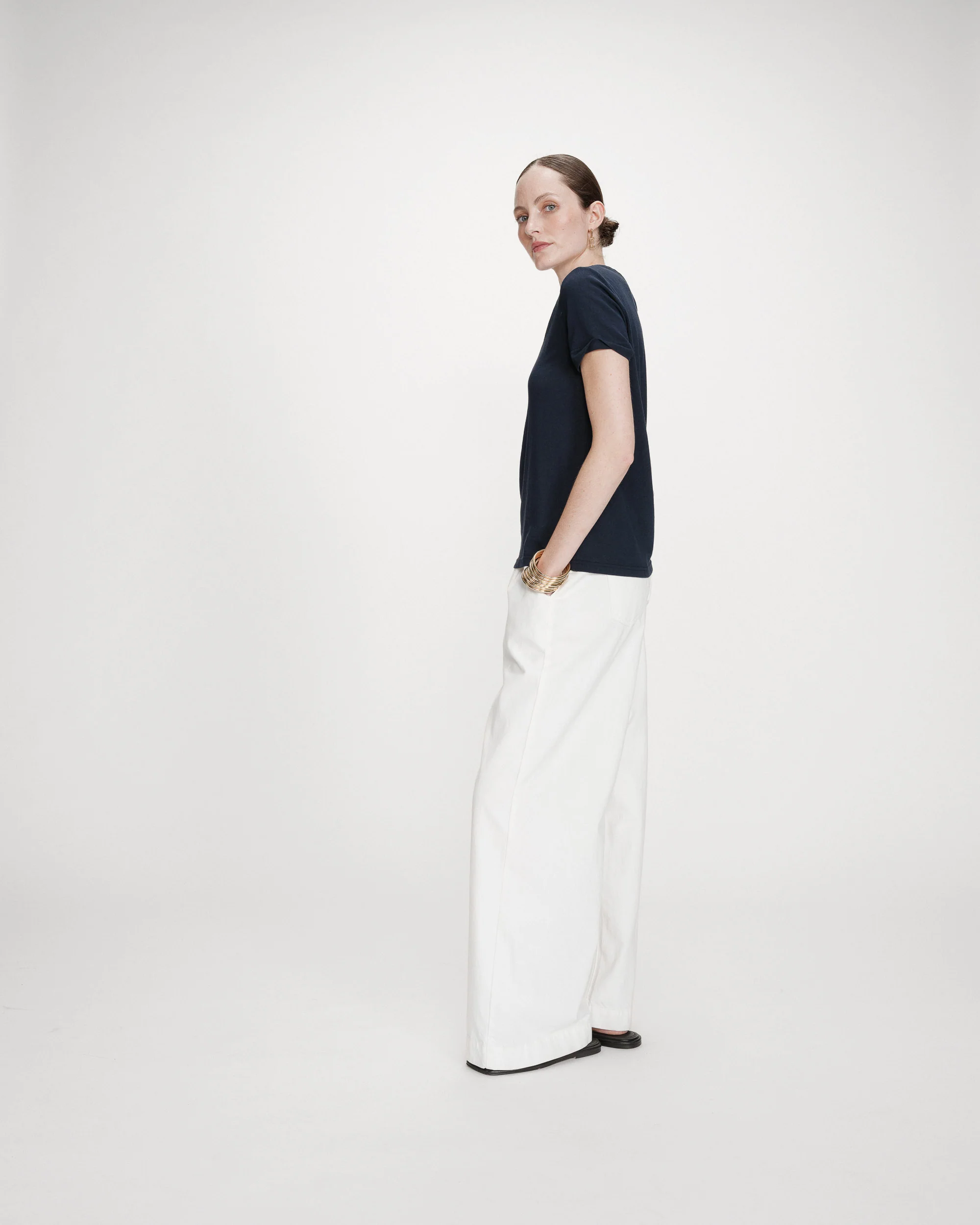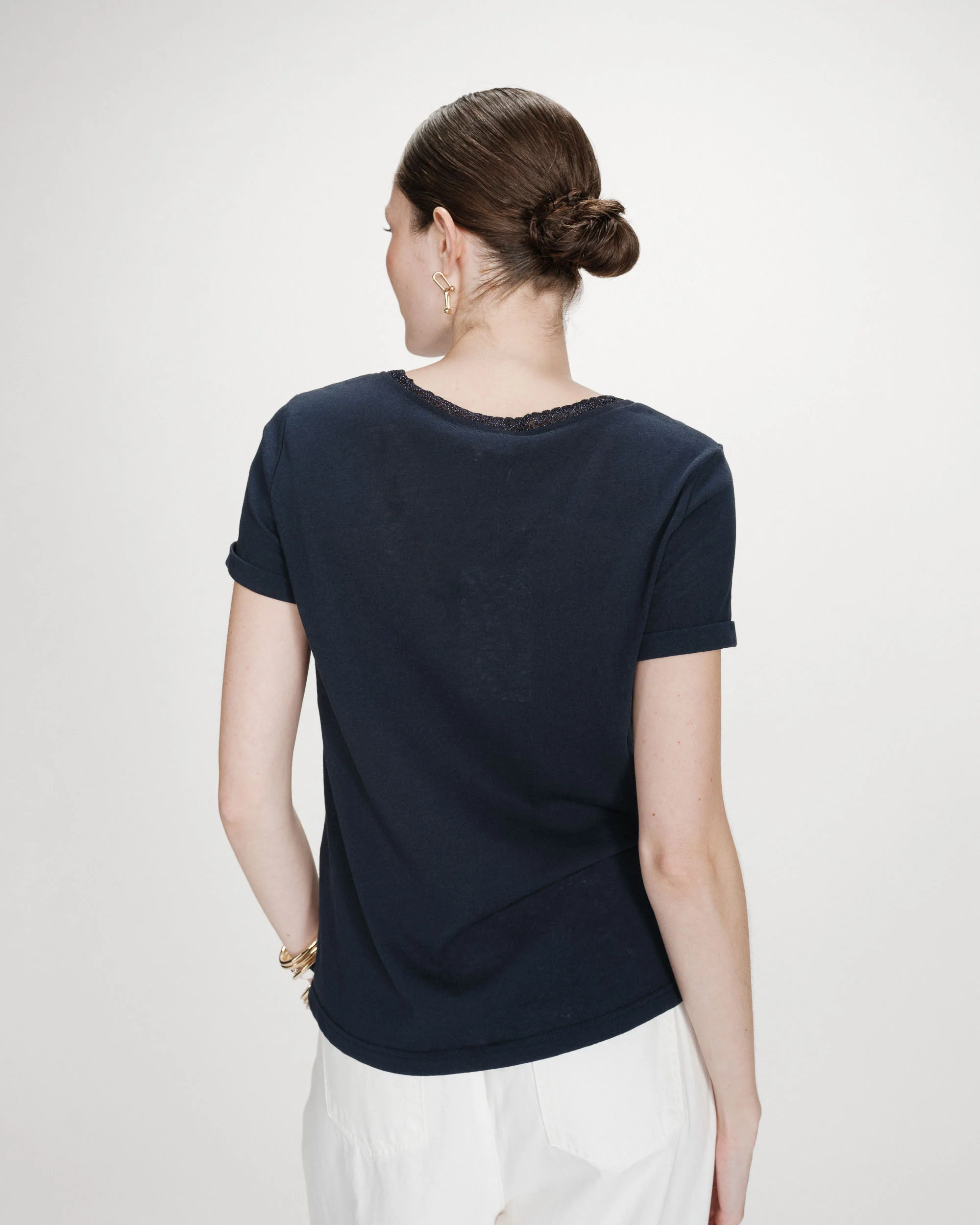 Camiseta de manga corta adornada con un ribete de lurex en el escote en V.