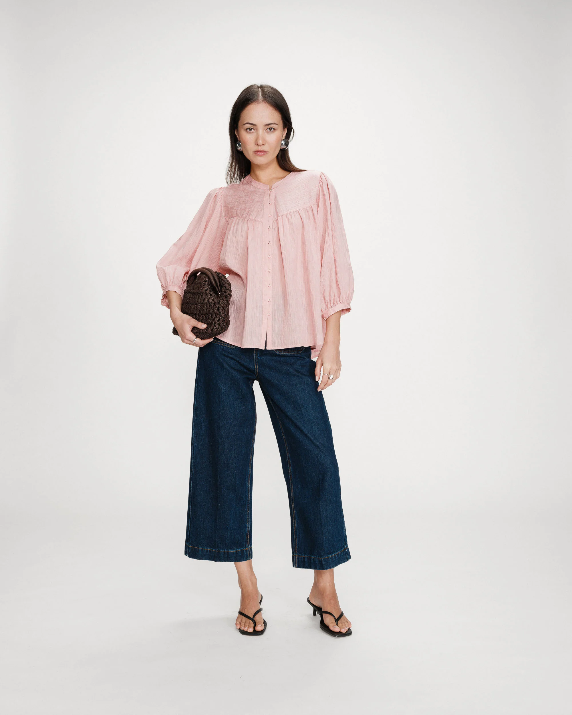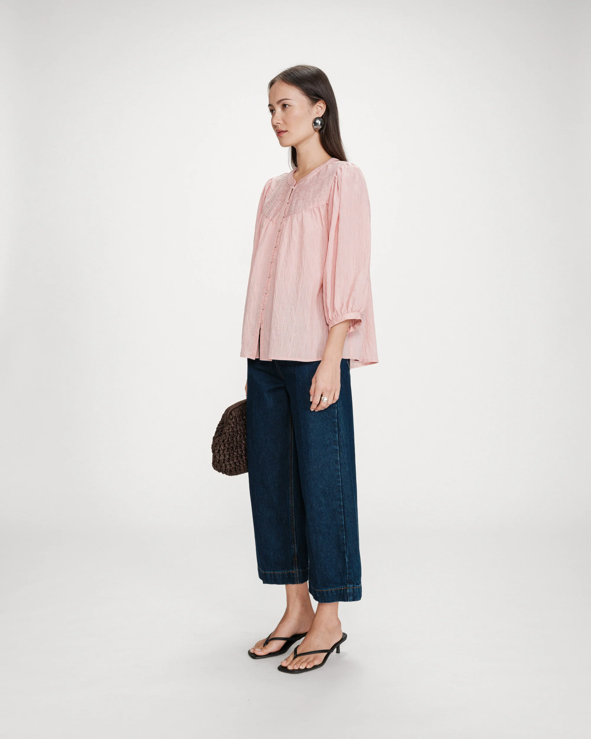 Blusa con mangas 3/4 abullonadas y un cuello redondo.