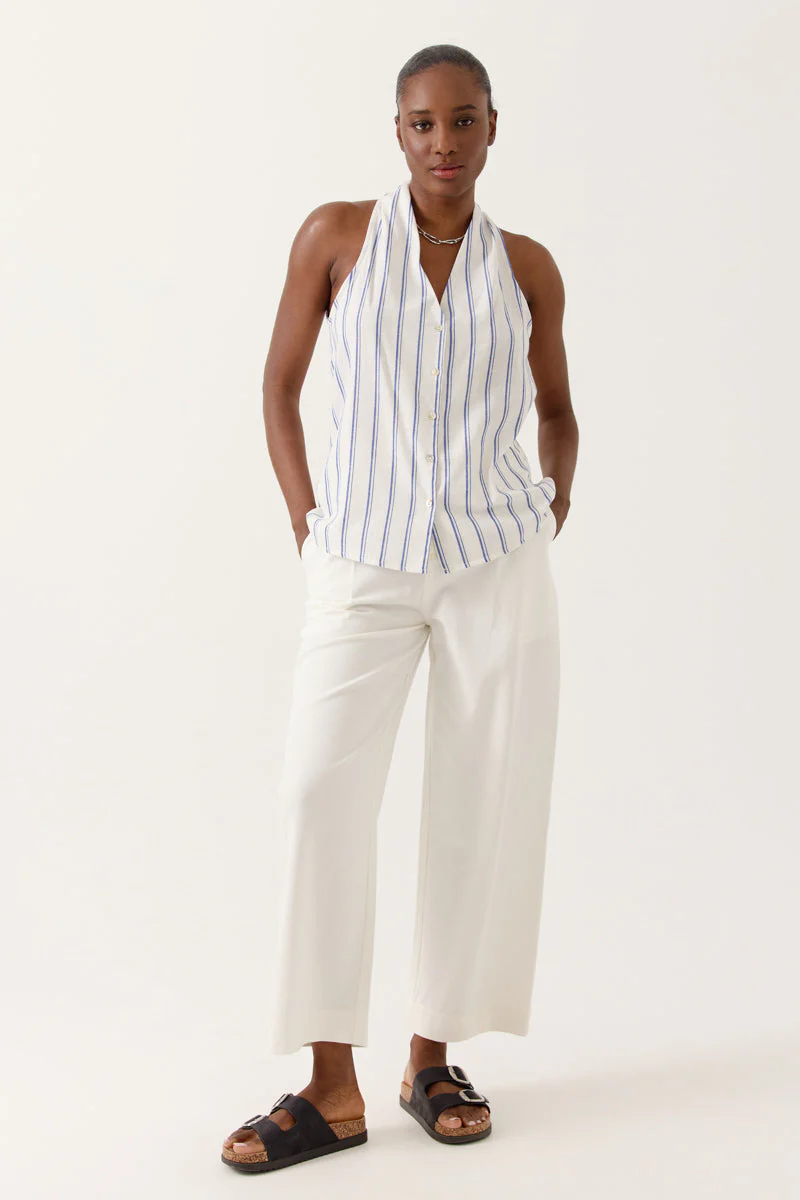 Top de rayas sin mangas con cuello halter y escote abierto.