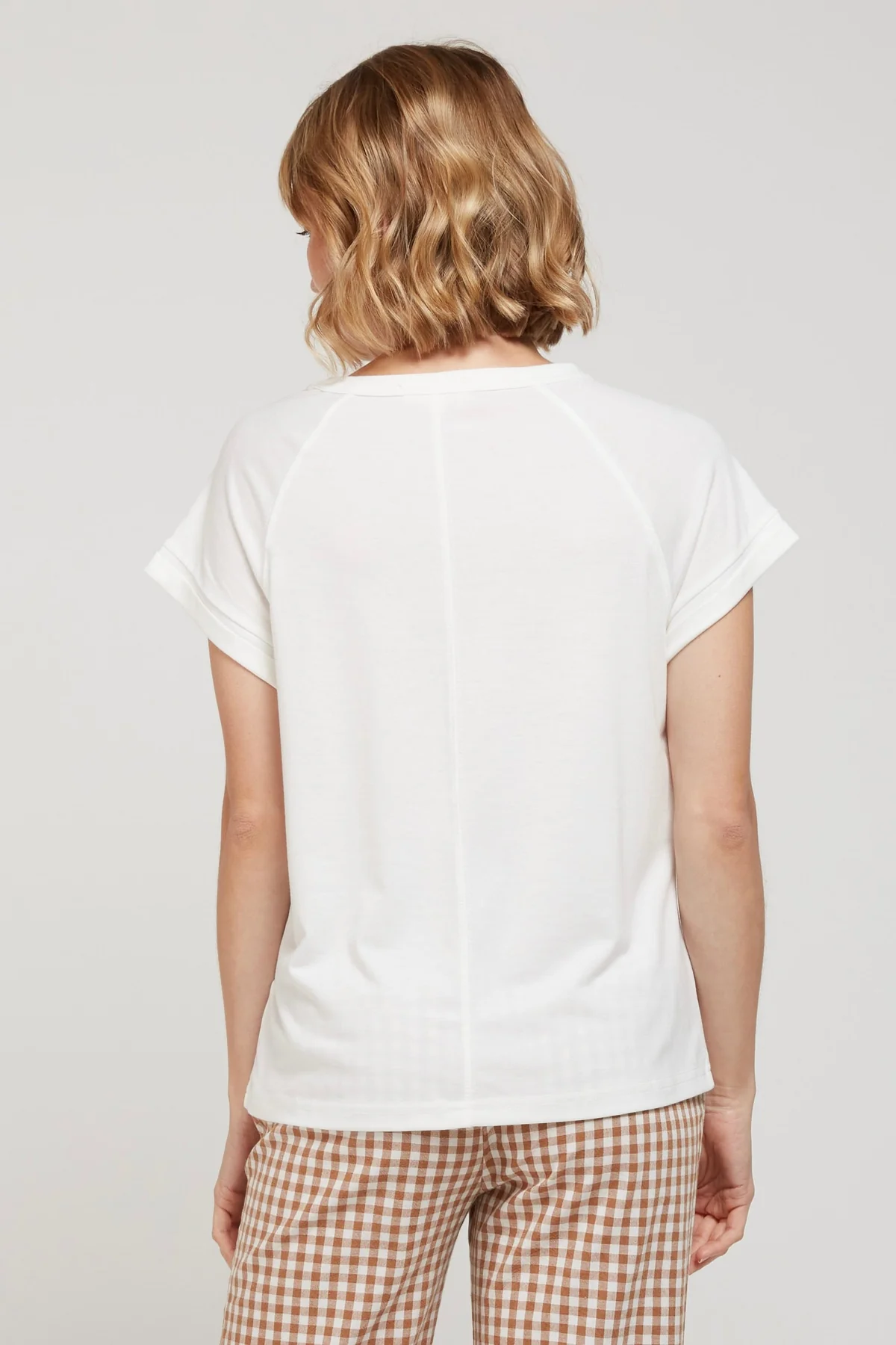 Camiseta de manga corta lisa con cuello redondo amplio.