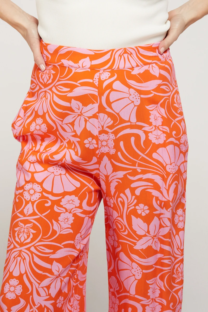 Pantalón de talle alto con corte recto, tejido fluido y con un estampado tropical.