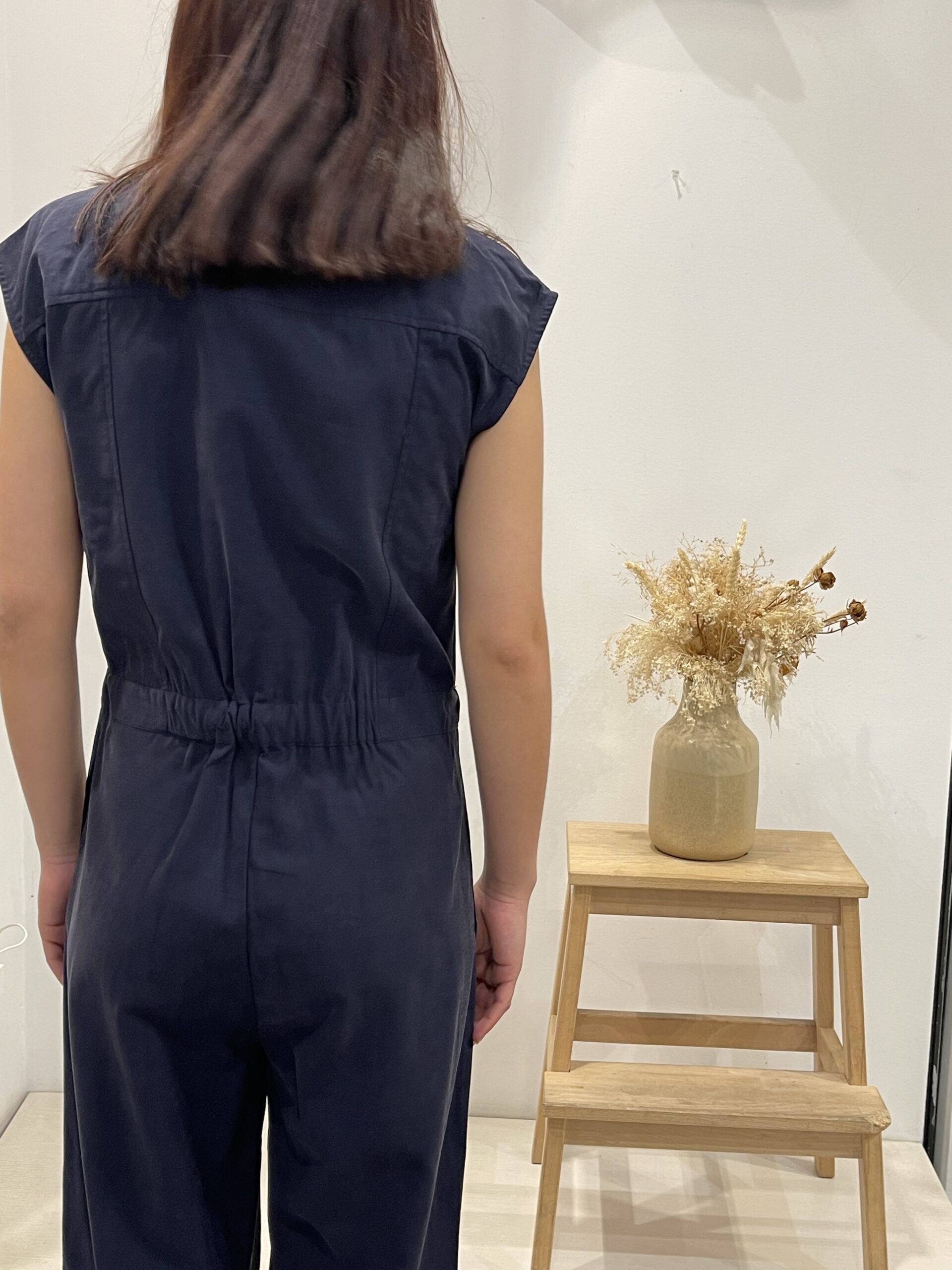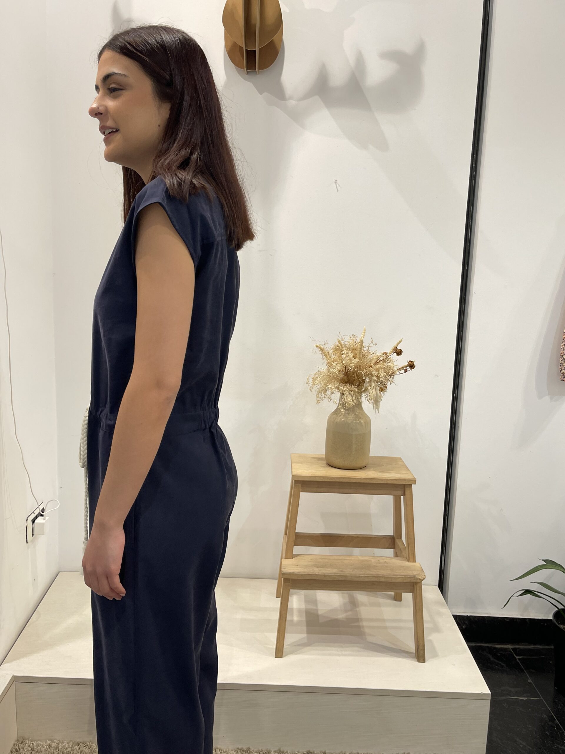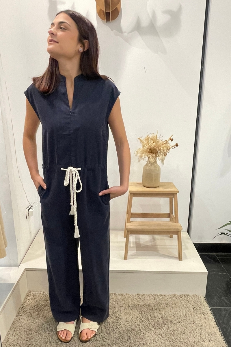 Mono de manga corta con escote en V con cinturón y bolsillos.
