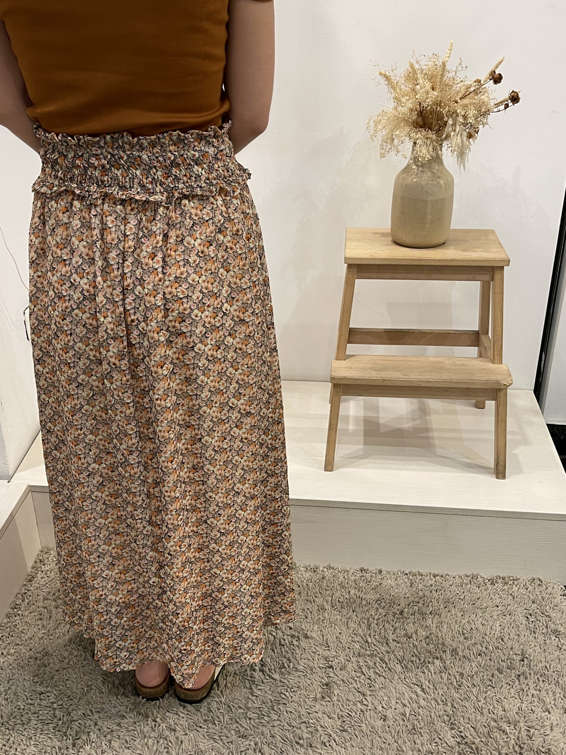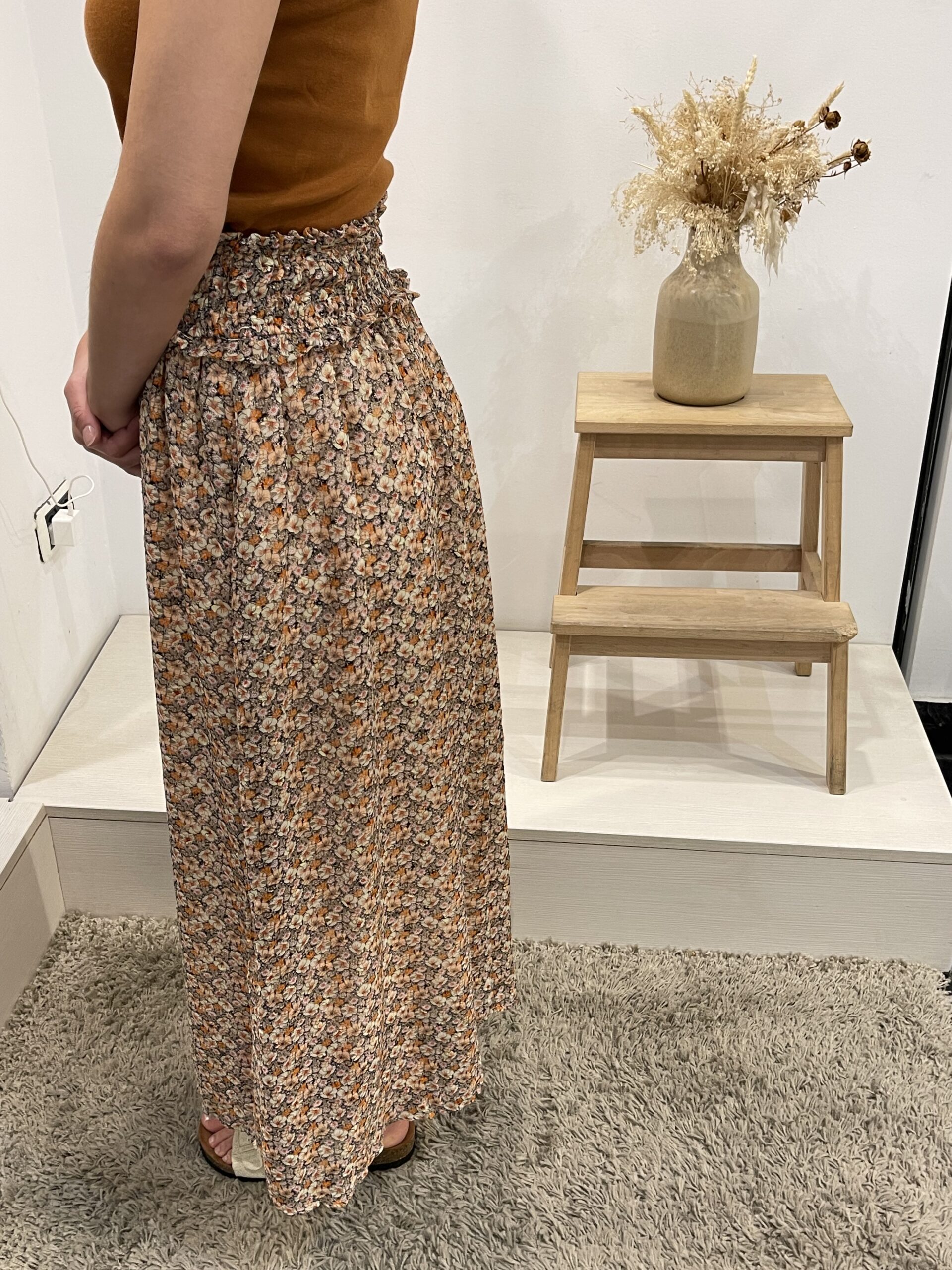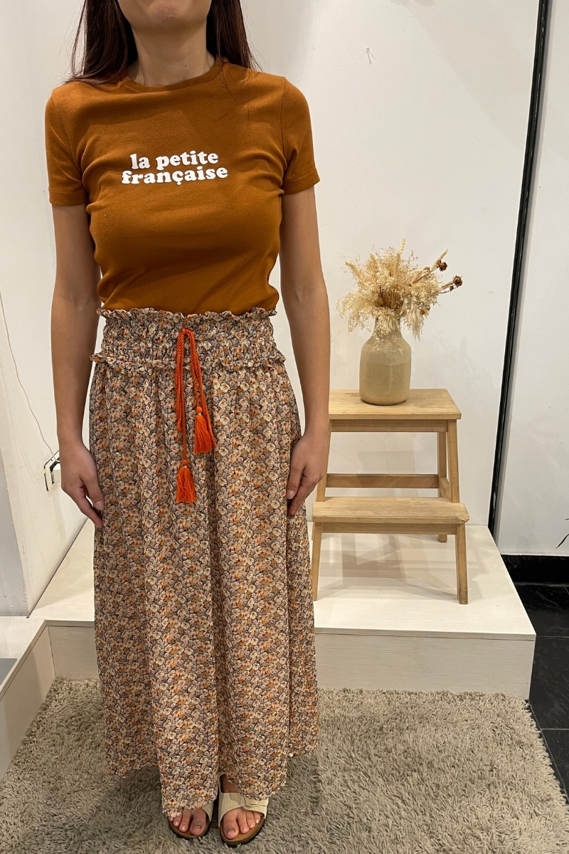 Falda larga estampada con cintura elastica y cinturón.