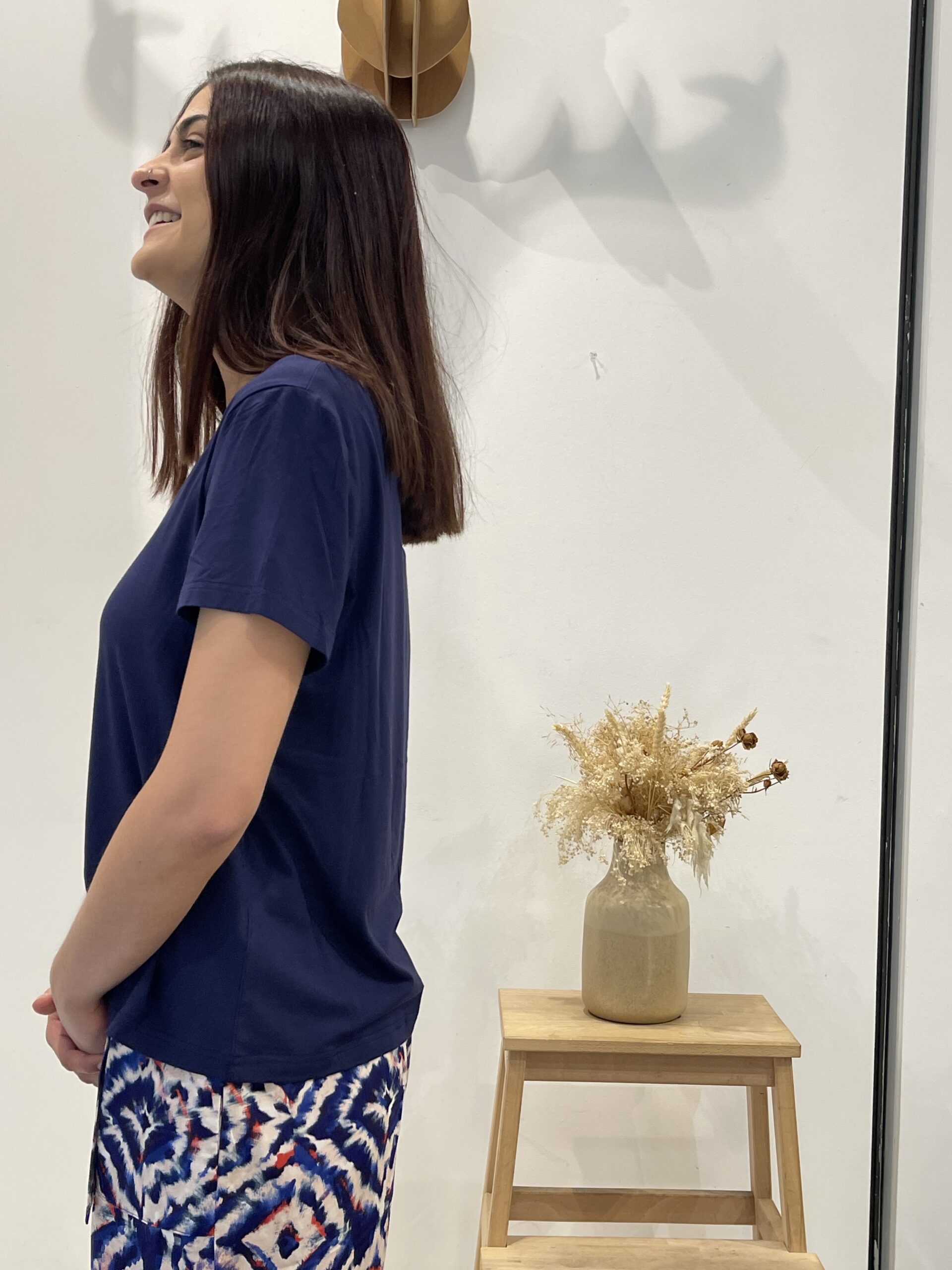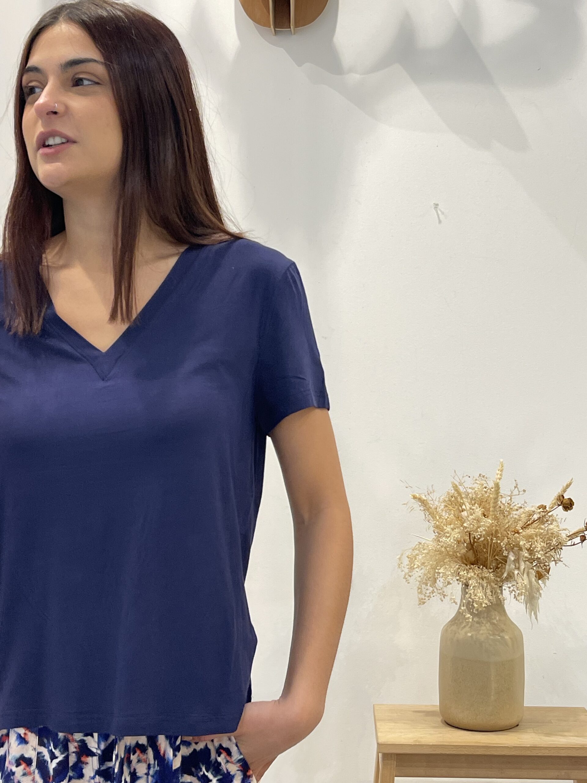 Camiseta fluida de manga corta y escote en pico.