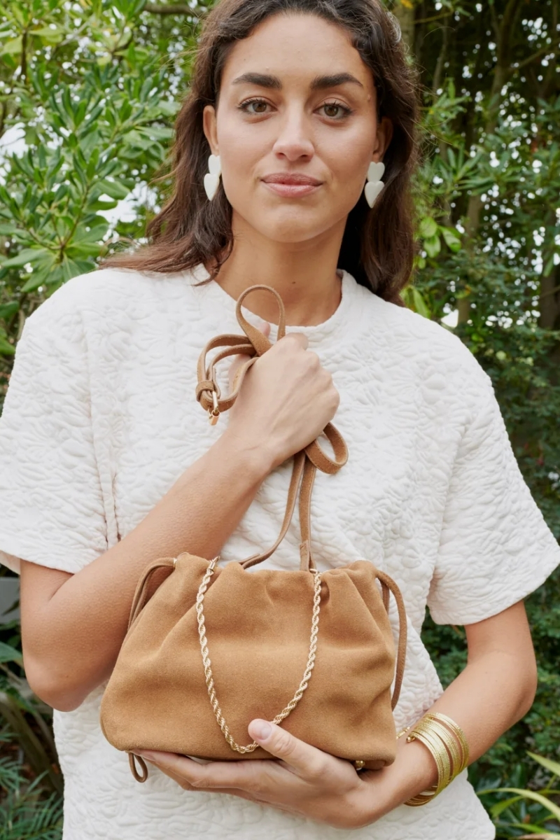 Bolso suave y elegante que se cierra con lazos de cuero.