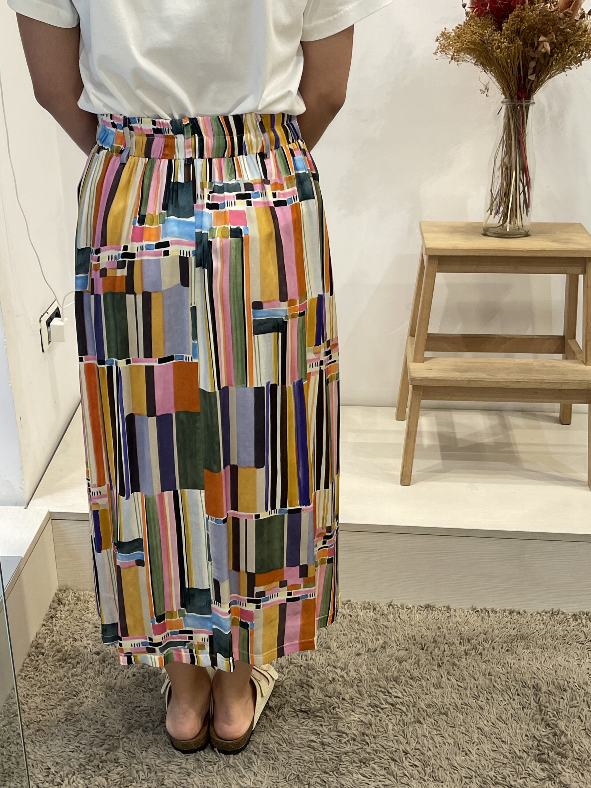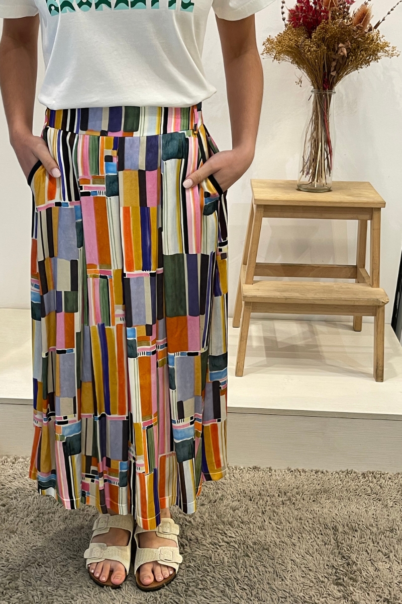Falda larga estampada con elastico en la cintura y bolsillos laterales.