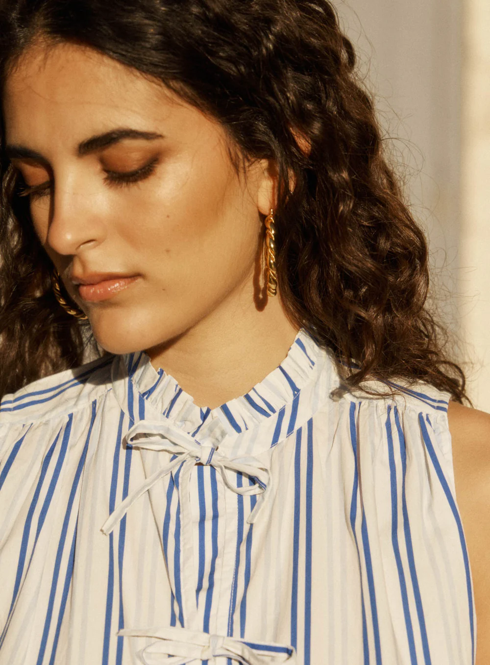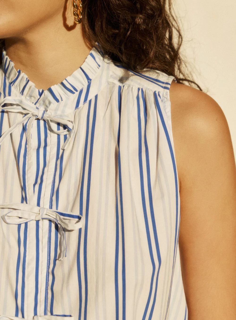 Top de corte recto con cierre de lazo a rayas azules y cuello fruncido.