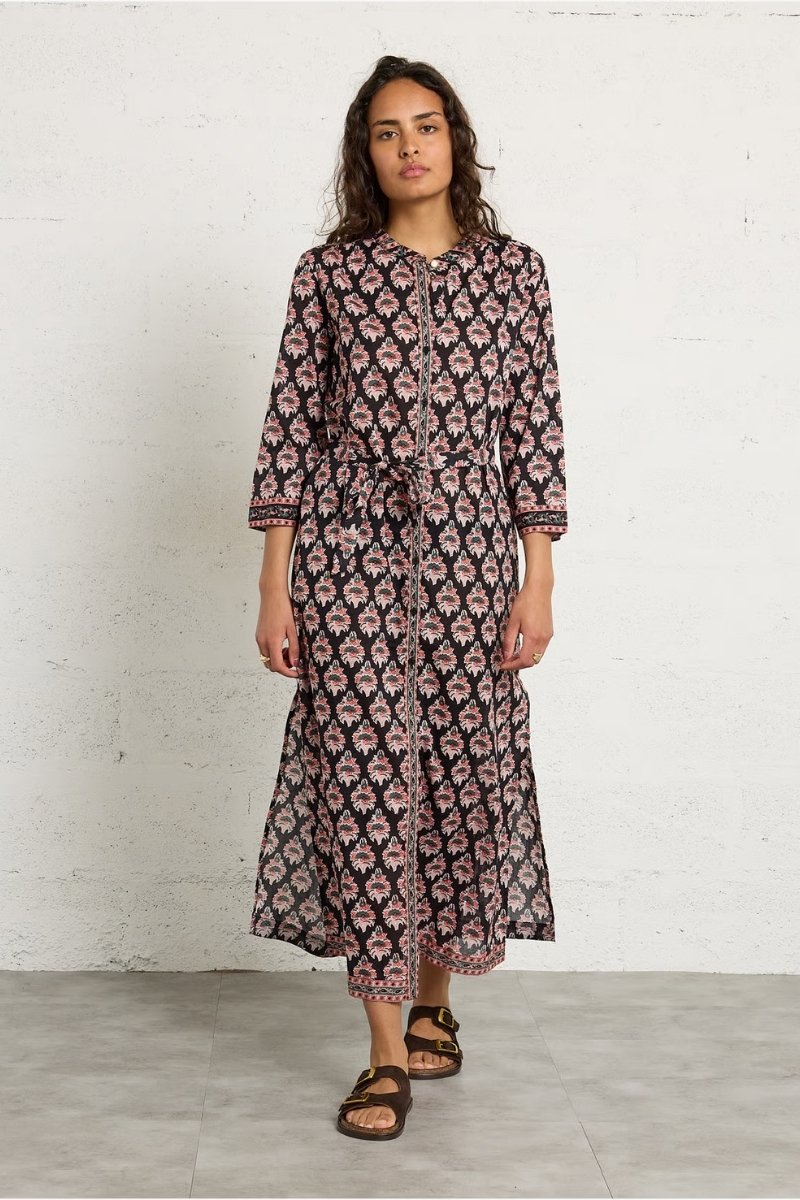 Vestido largo recto con cinturón.