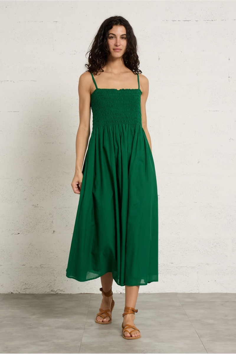Vestido largo con elástico fruncido en el pecho y finos tirantes.